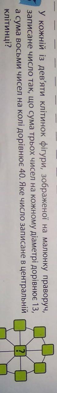 У кожній із дев'яти клітинок фігури, зображеної на малюнку праворуч, записане число так, що сума трьох чисел на кожному діаметрі дорівнює 13, a сума восьми чисел на колі дорівнює 40. Яке число записане в центральній клітинці?