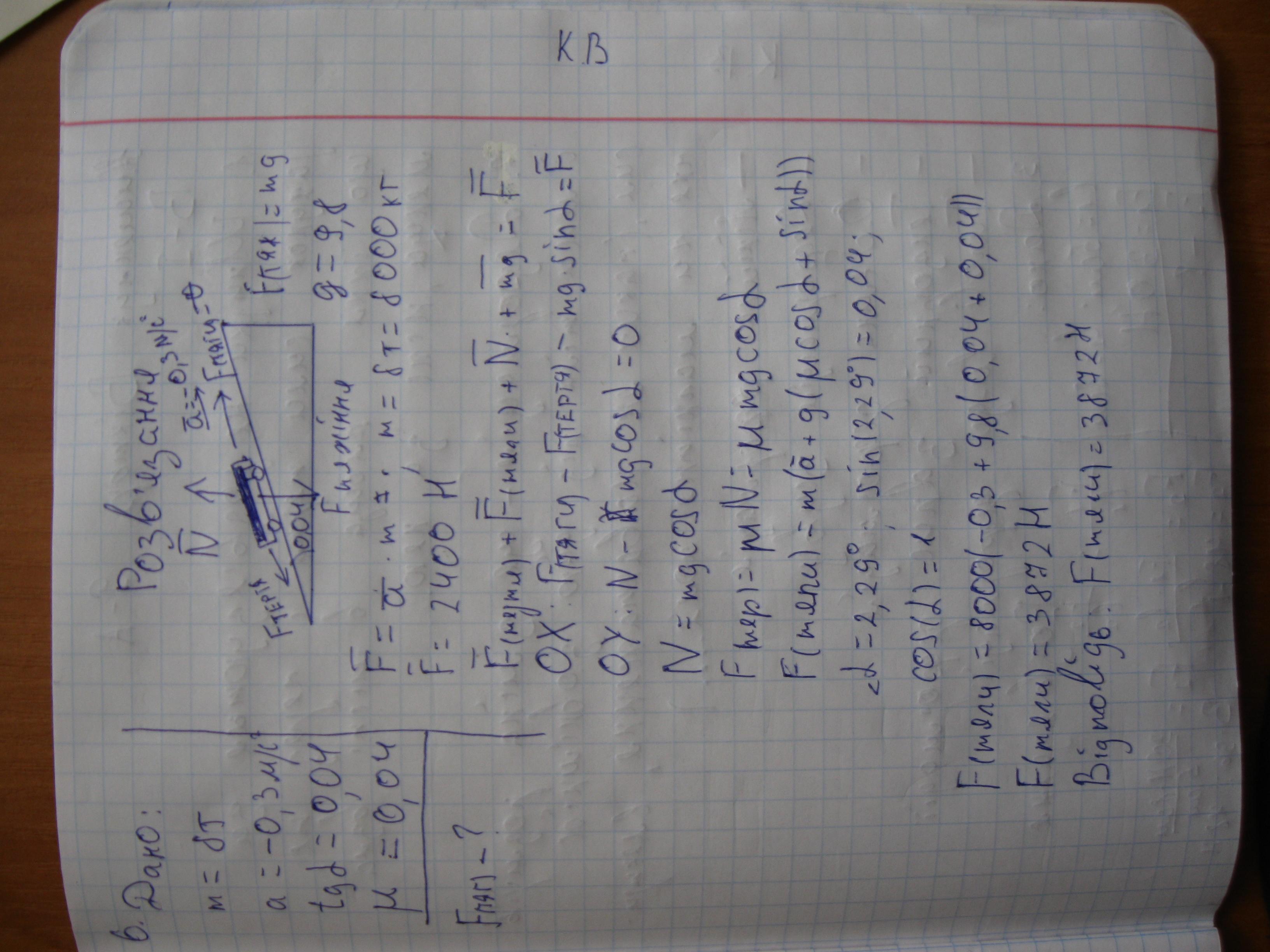 Автомобіль масою 8 рухається на гору сповільнюючи свій рух з прискоренням 0,3м/с2 , обчисліть силу тяги, якщо ухил становить 0,4, а коефіцієнт тертя 0,4