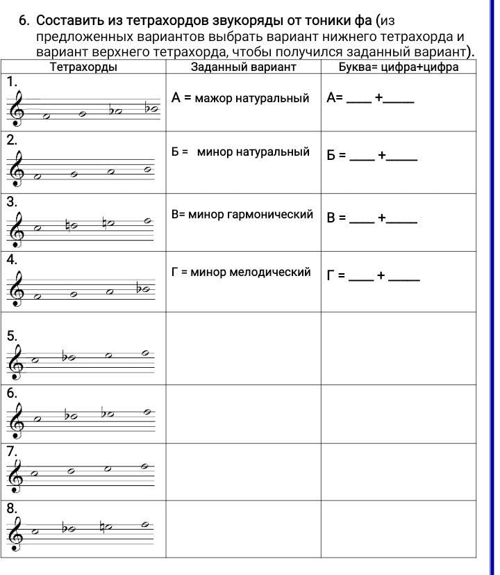 Составить из тетрахордов звукоряды от тоники фа (из предложенных вариантов выбрать вариант нижнего тетрахорда и вариант верхнего тетрахорда, чтобы получился заданный вариант).