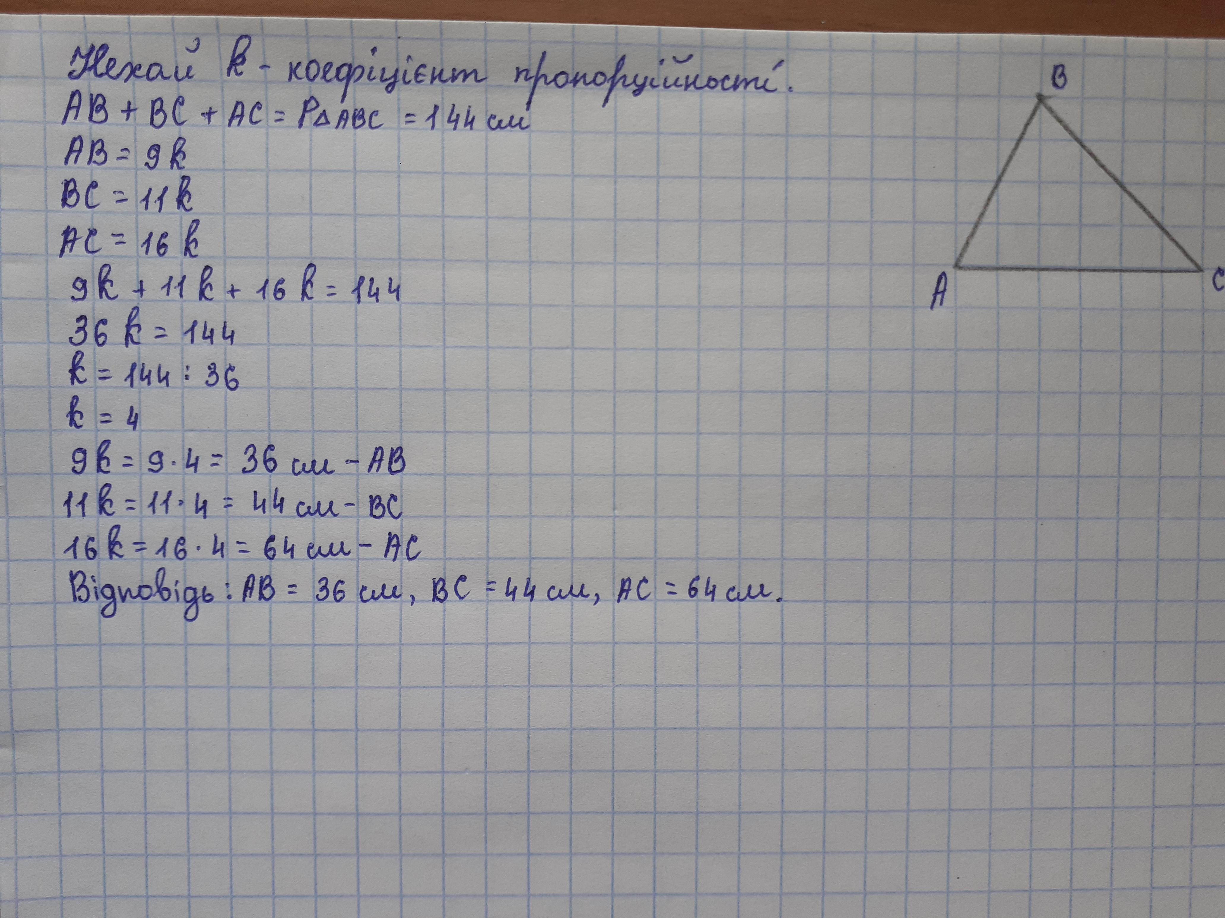 Периметр трикутника дорівнює 144 см, а довжини сторін відносяться як 9:11:16.