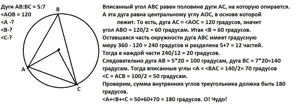 Треугольник ABC вписан в окружность с центром в точке O так, что отношение длин дуг AB и BC равно 5:7. Найдите углы треугольника ABC если угол AOC равен 120 градусов
