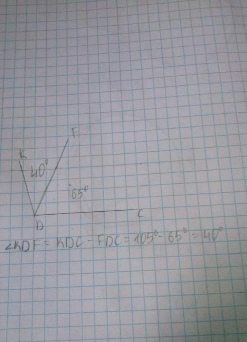 5. Начертите угол KDC, равный 105°. Лучом DF разделите этот угол так, чтобы угол FDC был равен 65°. Вычислите градусную меру угла KDF