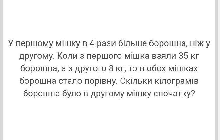 Пусть х кг. было во втором мешкетогда в первом мешке было в 4 раза больше, то есть 4х кг.из первого взяли 35 кг. значит: 4х - 35 (кг.) в нём стало,а из первого взяли 5 кг. значит: х - 5 (кг.) стало в этом мешке, и их вес стал равным. Составляем уравнение:4х - 35 = х - 5 , перенесём неизвестные (т.е. те которые с х) в левую часть уравнения, а известные в правую, получим:4х - х = 35 - 53х = 30х= 10 (кг.) было во втором мешке. а в первом в 4 раза больше10 * 4 = 40 (кг.)