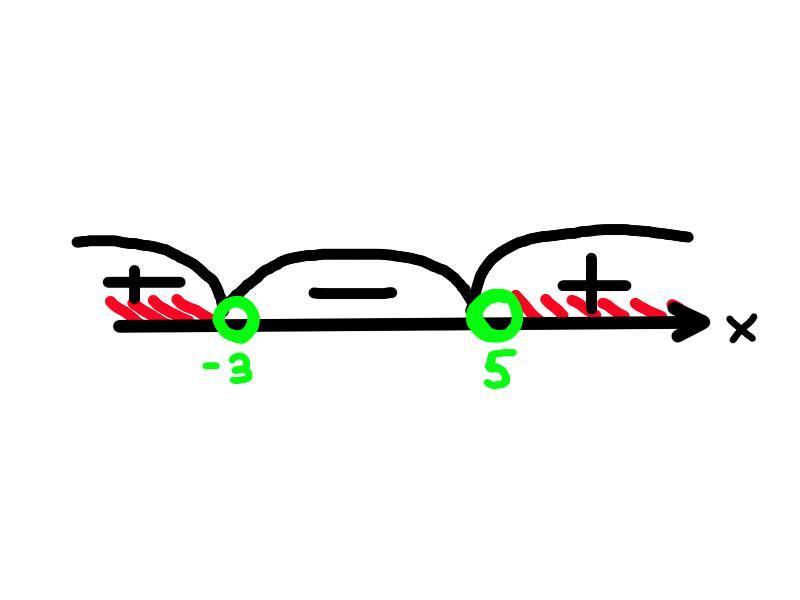 Применяем метод интервалов. Неравенство строгое, поэтому точки будут выколотые. Получаем интервалы: