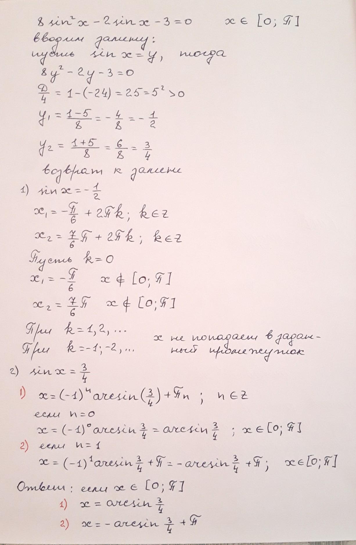 8sin^2 x-2sinx-3=0 решить и наити решения на промежутке [0;П]