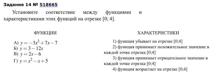 Установите соответствие между функциями и характеристиками этих функций на отрезке [0; 4].