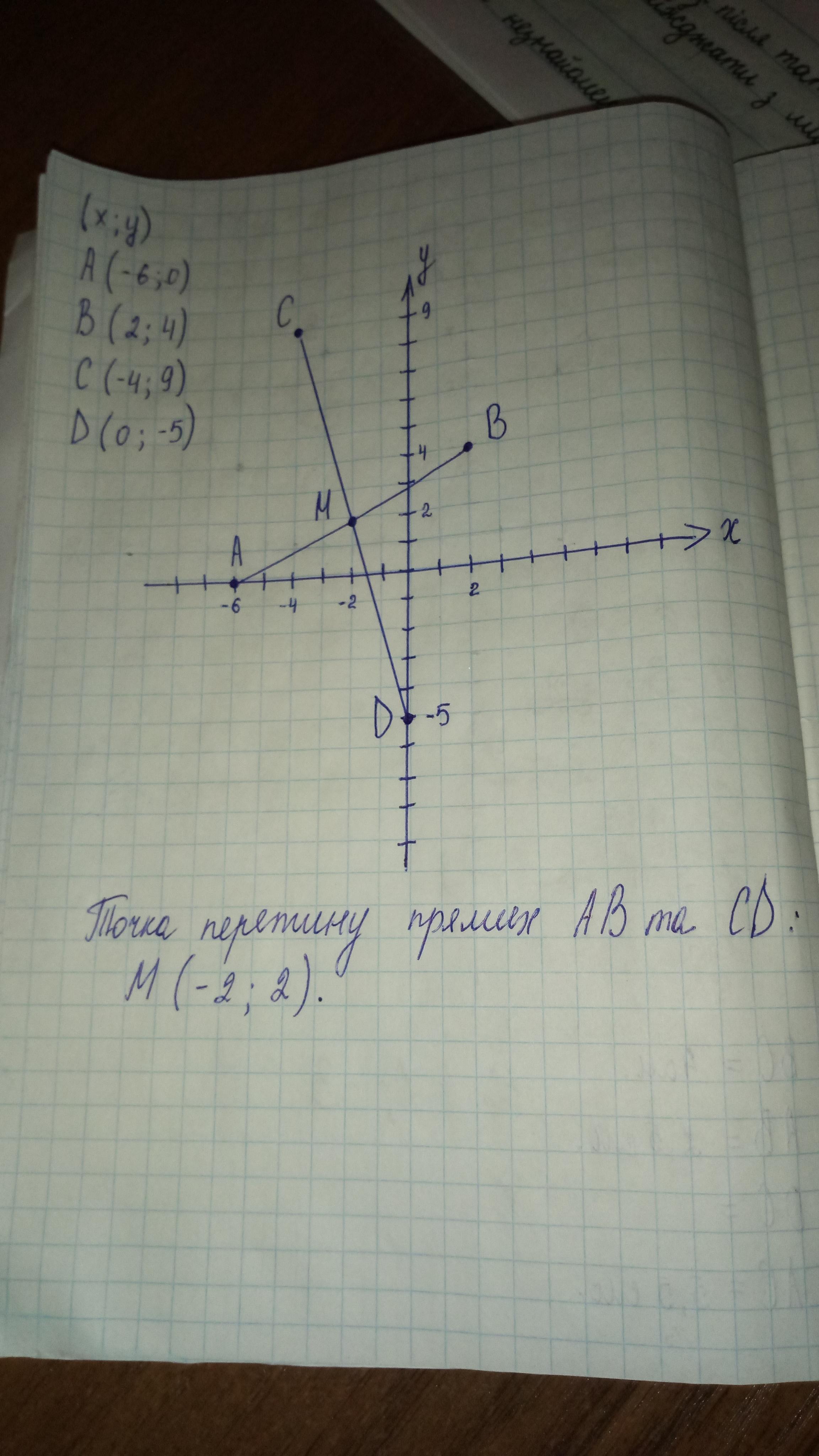 Познач наи координатній площині точки А(-6;0) В (2;4) С(-4;9) D(0;-5) .Побудуй прямы АВ та СD. знайдіть координати точки перетину цих прямих