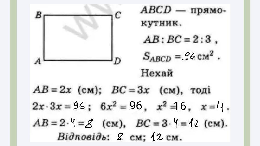 3 : 2, а площа прямокутника дорівнює 96 см2. Ящо можна то дано також написати