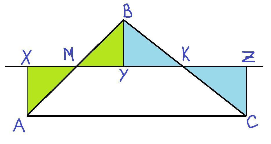 Так как нужно доказать, что вершины треугольника равноудалены от прямой МК, то проведем перпендикуляры к этой прямой из вершин треугольника: АХ, BY и CZ (расстояние от точки до прямой есть перпендикуляр).