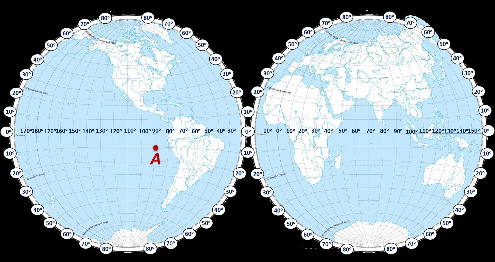 10 градусов южной широты и 90(может быть 89,так как точка стоит неровно,но погрешность в 2-3 градуса допускается в школьной программе)градусов западной долготы