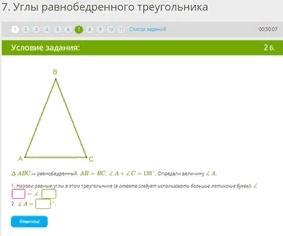 1. Назови равные углы в этом треугольнике (в ответе следует использовать большие латинские буквы) ∡