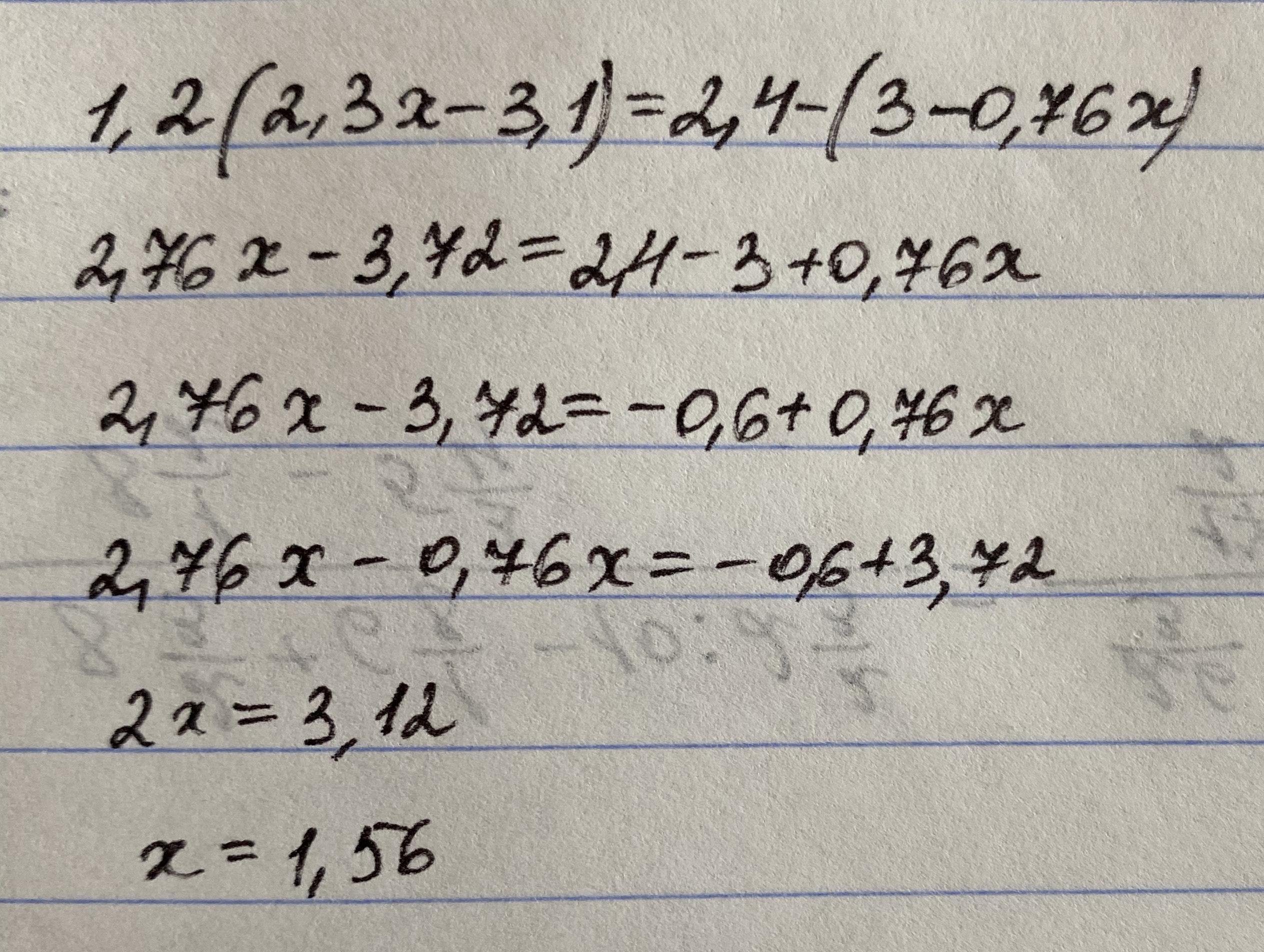 1,2•(2,3х – 3,1) = 2,4 – (3 – 0,76х)