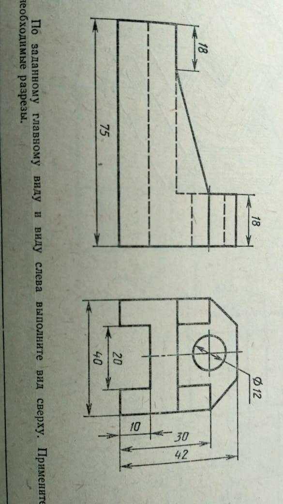 При построении третьего вида пришлось предположить, что ширина нижней выемки, расстояние между наклонными стойками и ширина поверхности детали сверху одинаковы, тогда на виде сверху часть штриховых линий, показывающих нижнюю выемку, не видна.
