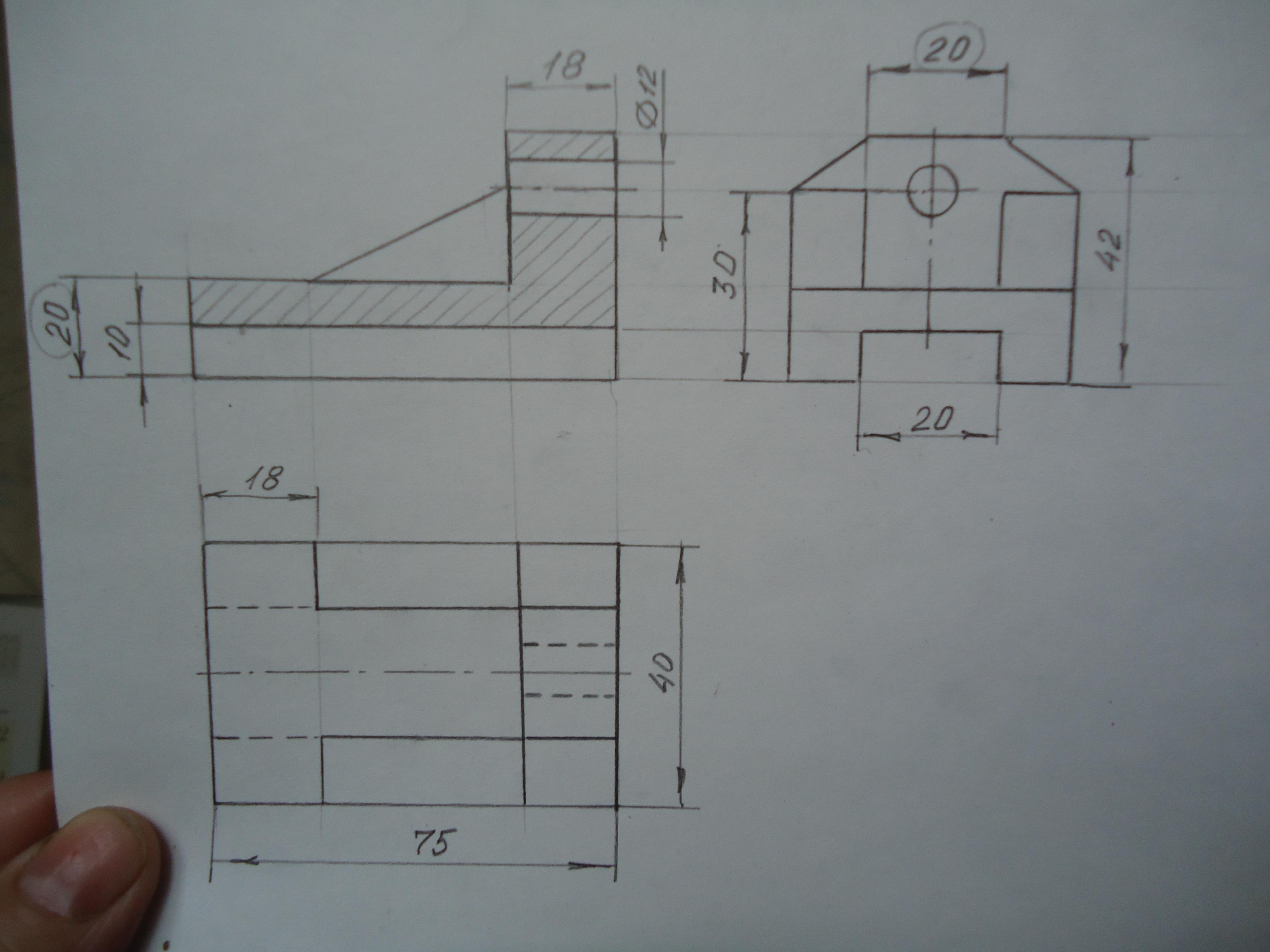Пришлось добавить два размера: высоту основания детали 20 мм (она вообще отсутствует на чертеже) и размер по ширине детали сверху 20 мм. Эти размеры я пометила кружком.