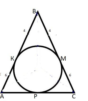 Коло, вписане в рівнобедрений трикутник, ділить його бічну сторону на два відрізки 4 см і 6 см, починаючи з вершини, що лежить проти основи. Знайдіть периметр трикутника