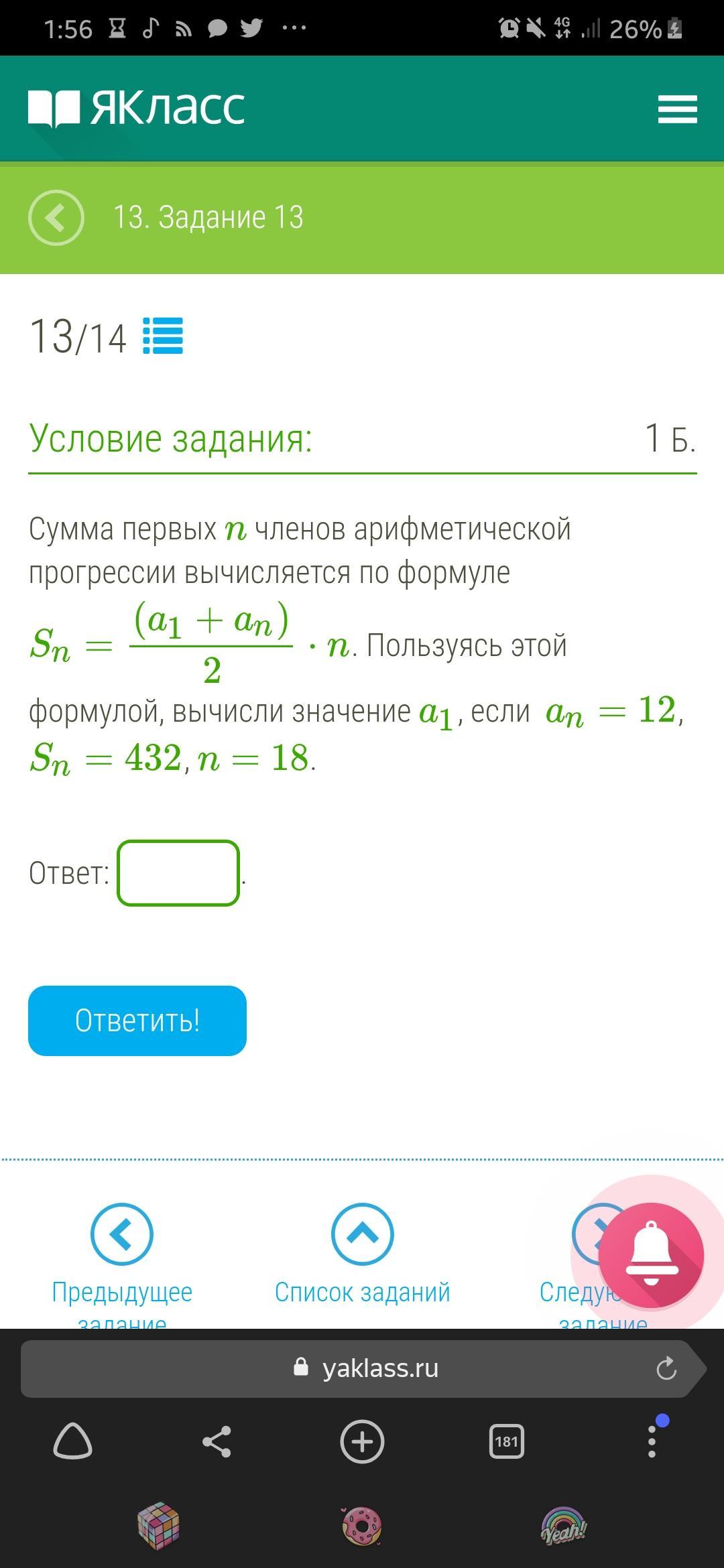 Согласно заданным значениям и заданной формуле производим вычисления (неизвестную а₁ обозначим х):