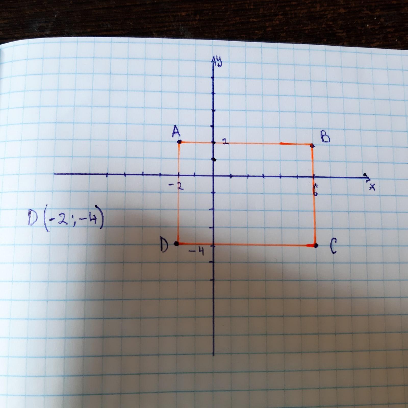 побудуйте в кондинатний площини прямокутник abcd из вершинами A (-2;2) B(6;2) C (6;-4) яки кординаты мае точка D