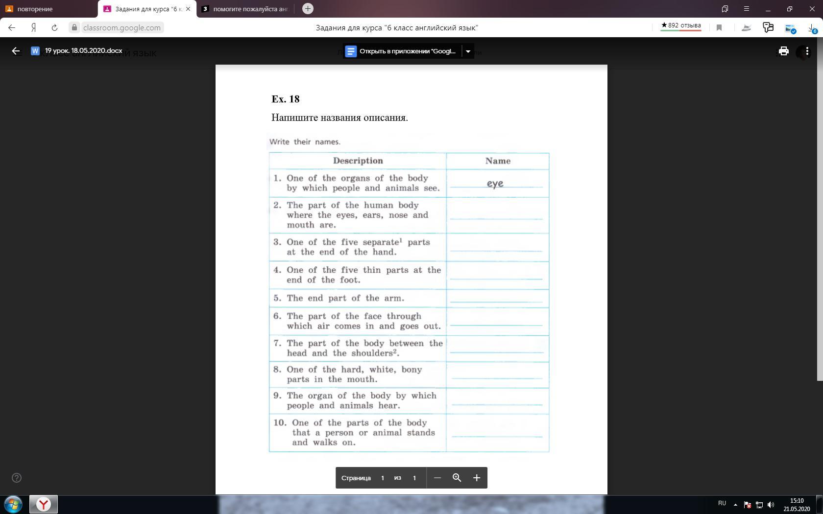 2. hand 3. finger 4. toe 5. brush 6. nose 7. neck 8. tooth 9. ear 10. foot или leg (думаю и то, и то подойдёт)