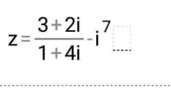 z=(3+2i)/(1+4i)-i⁷=(11-10i)/17-i=(11-10i-17i)/17=(11-27i)/17=(11/17)-(27i/17)
