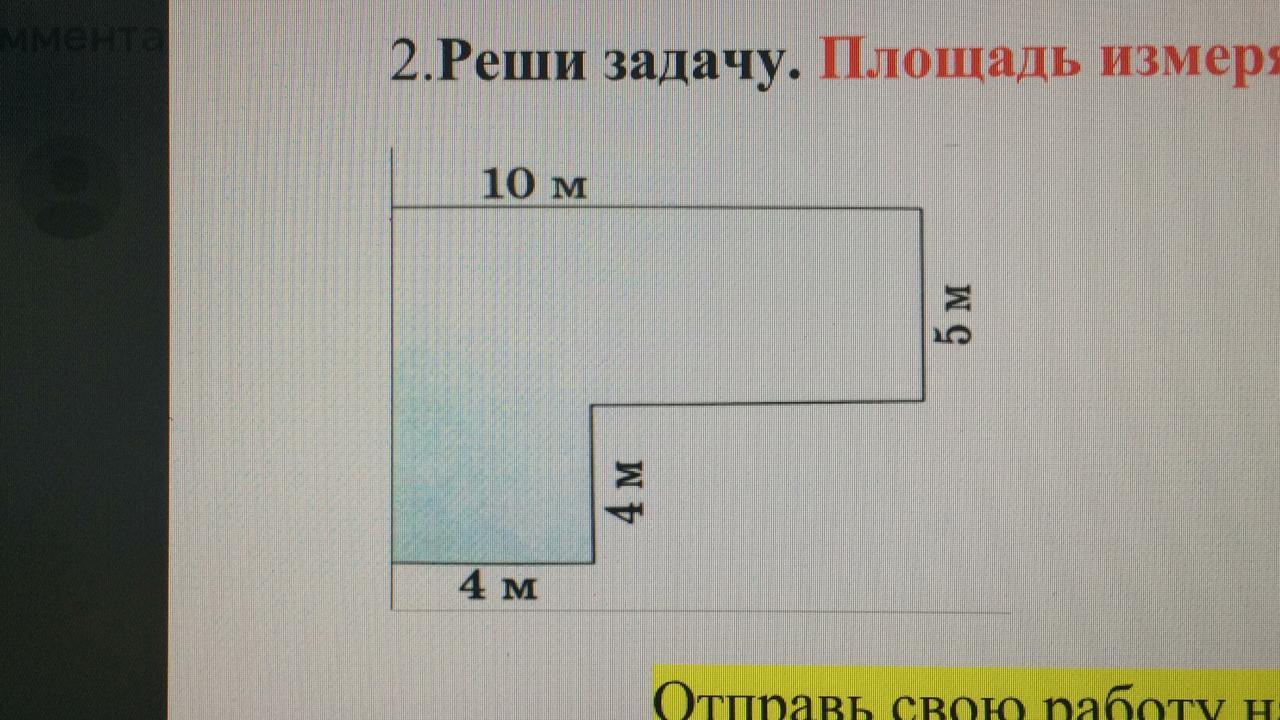 Размеры большого прямоугольника , от которого отрезали маленький, 10х9=90/м²/, а маленького отрезанного (10-4)х4=6*4=24/м²/, тогда площадь искомой голубой фигуры равна 90-24=66/м²/