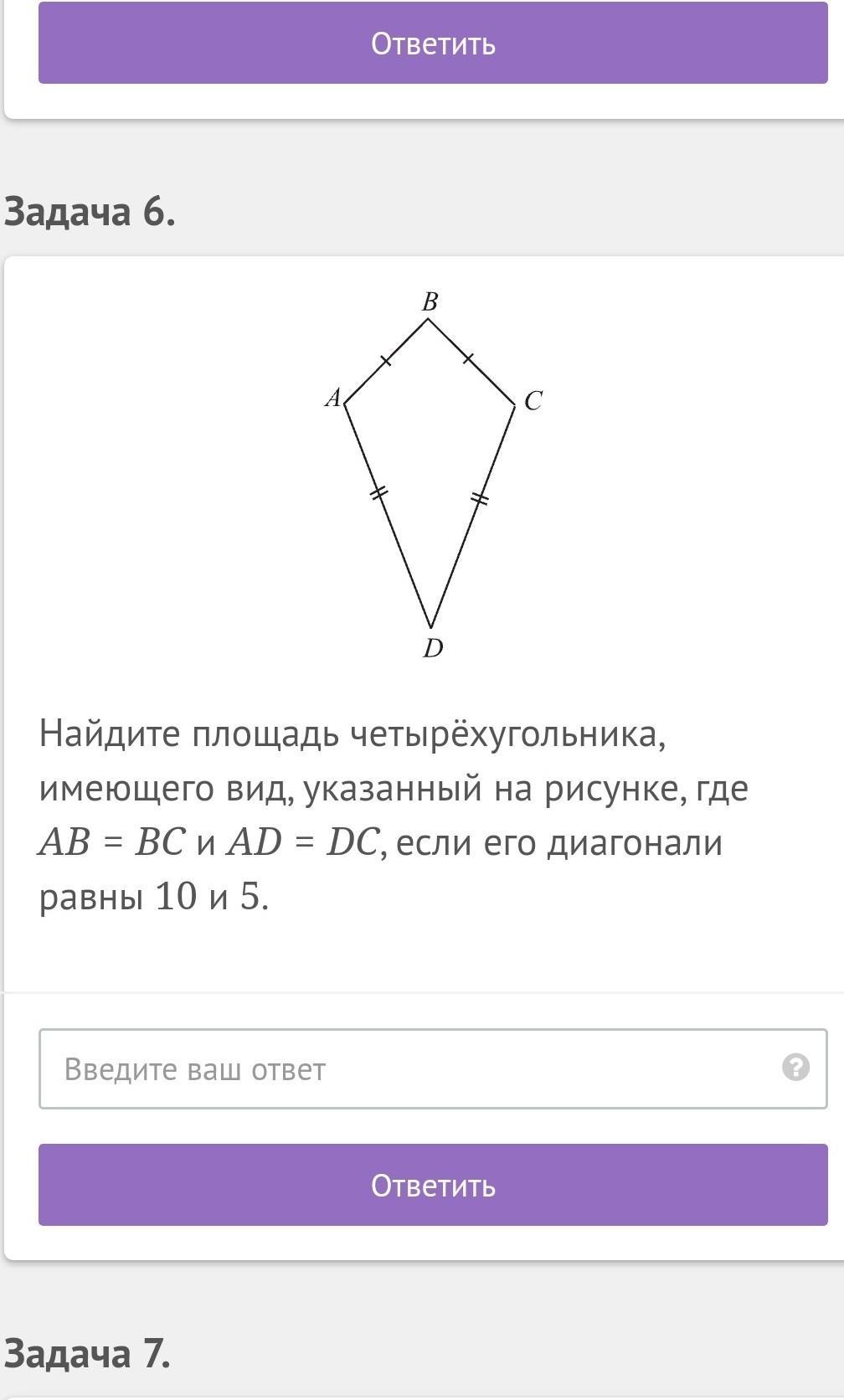 Найдите площадь четырёхугольника, имеющего вид, указанный на рисунке, где AB=BC и AD=DC, если его диагонали равны 10 и 5.