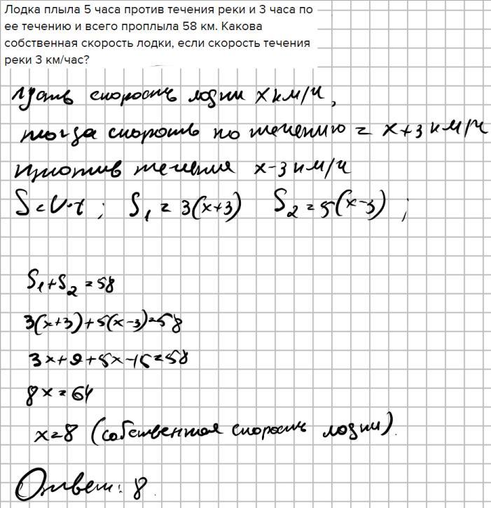 Лодка плыла 5 часа против течения реки и 3 часа по