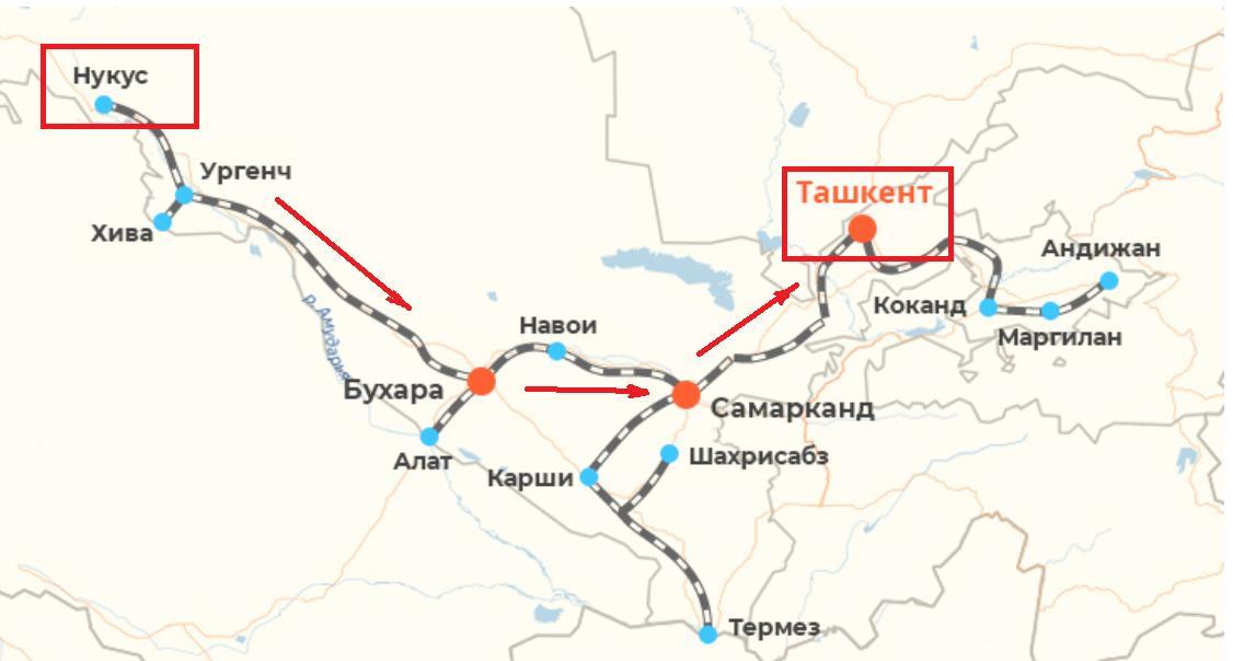 через какие области проходит дорога соединяющая Нукус Ташкент