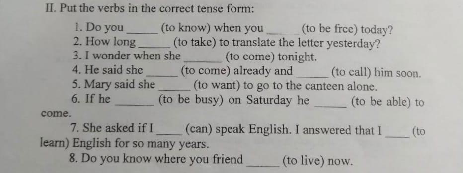 1 know...will be free 2 did it take 3 will come 4 had come....would call 5 wanted 6 is not ...will be able 7 could..... had been learning 8 is living