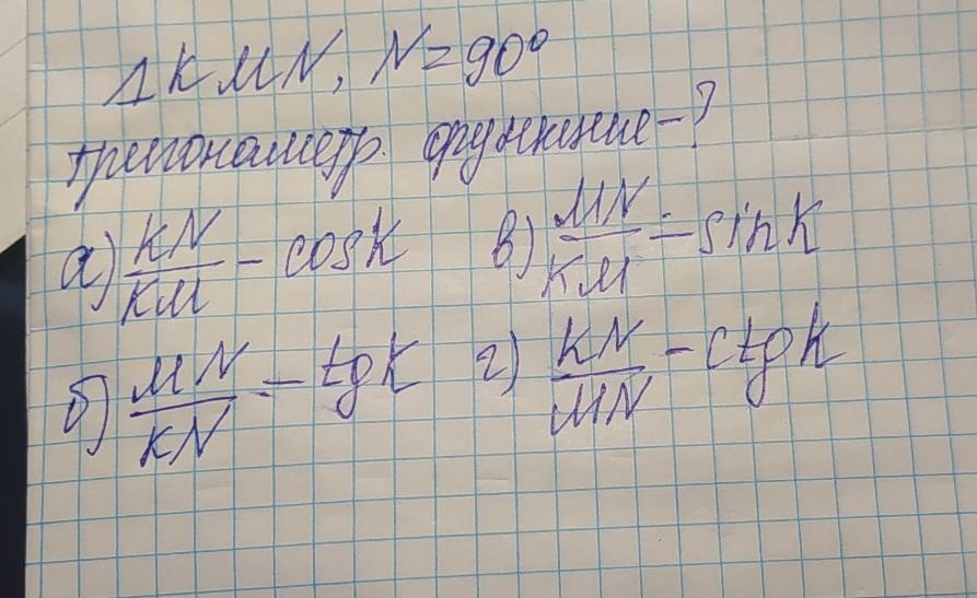 Определите, какая тригонометрическая функция угла K выражается дробью 1)KN/KM, 2)MN/KN, 3) MN/KM, 4)KN/MN