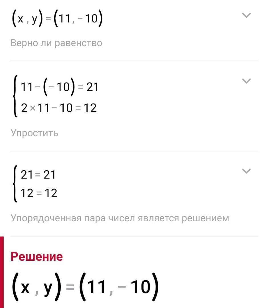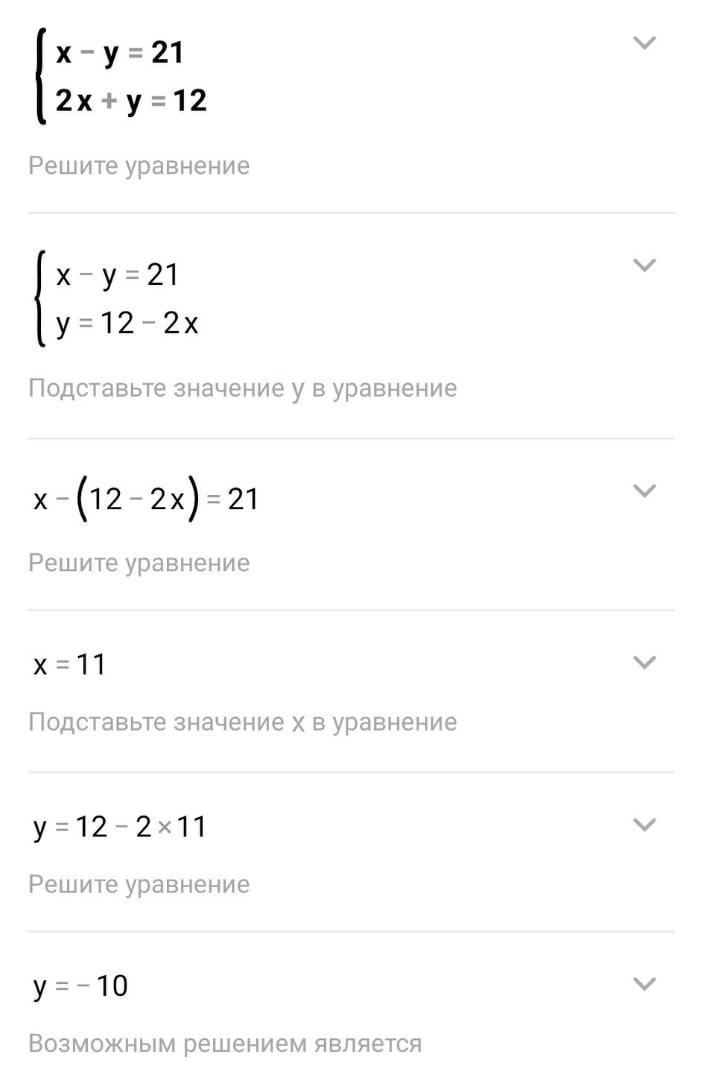 Решить задачу "Найдите два числа, если их разность равна 21, а сумма удвоенного большего из этих чисел и второго числа равна 12 "