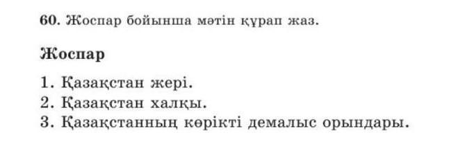 Ответ:Қазақтардың жері үлкен.Ол ең үлкен ел дегеннен 9-шы орын алады.Қазақ халқы бұрыннан мықты халықтардың бірі.Қазақстанның көрікті демалыс орыны өте көп.Маған көбінесе орманда,өзеннің қасында орналасқан демалыс орындар ұнайды.
