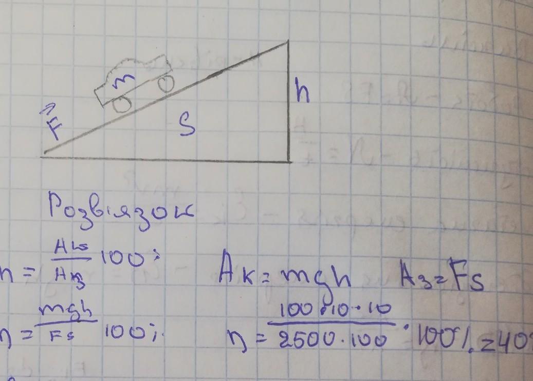 Висота похилої дороги дорівнює 10 м, а довжина 100 м. Щоб підняти по цій площині автомобіль масою 1000 кг, потрібно прикласти силу 2500 Н. Визначте ККД похилої дороги.