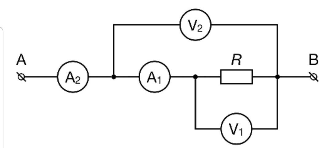 1) Напряжение резистора и первого вольтметра равно, и при этом в сумме с напряжением первого амперметра, полученное напряжение, будет равно показанию второго вольтметра, а ток протекающий через всю схему равен показанию второго амперметра.