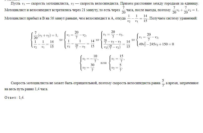 Из городов А и В навстречу друг другу одновременно выехали мотоциклист и велосипедист. Мотоциклист приехал в В на 56 минут раньше, чем велосипедист приехал в А, а встретились они через 21 минуту после выезда. Сколько часов затратил на путь из В в А велосипедист?
