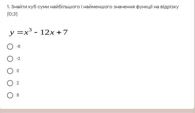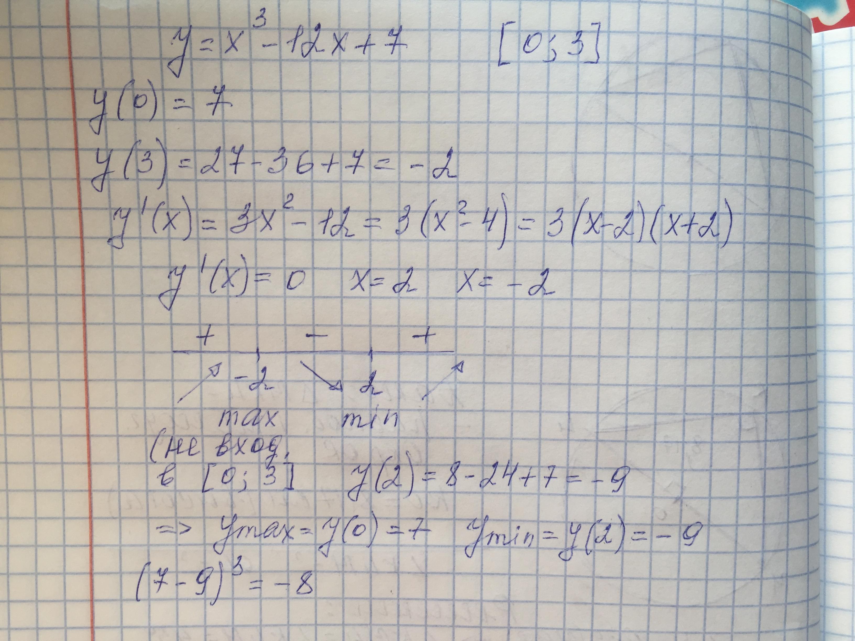 пожалуйста с обьяснением!!!!Найти куб суммы наибольшего и наименьшего значения функции на отрезке ⌈0; 3⌉