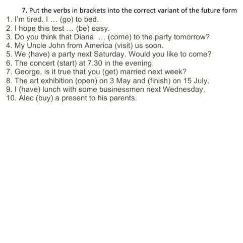 Ответ:1) will go 2)will be 3)will come 4)will visit 5)are having 6)starts 7)will get 8)opens finishes 9)will have 10)will buy
