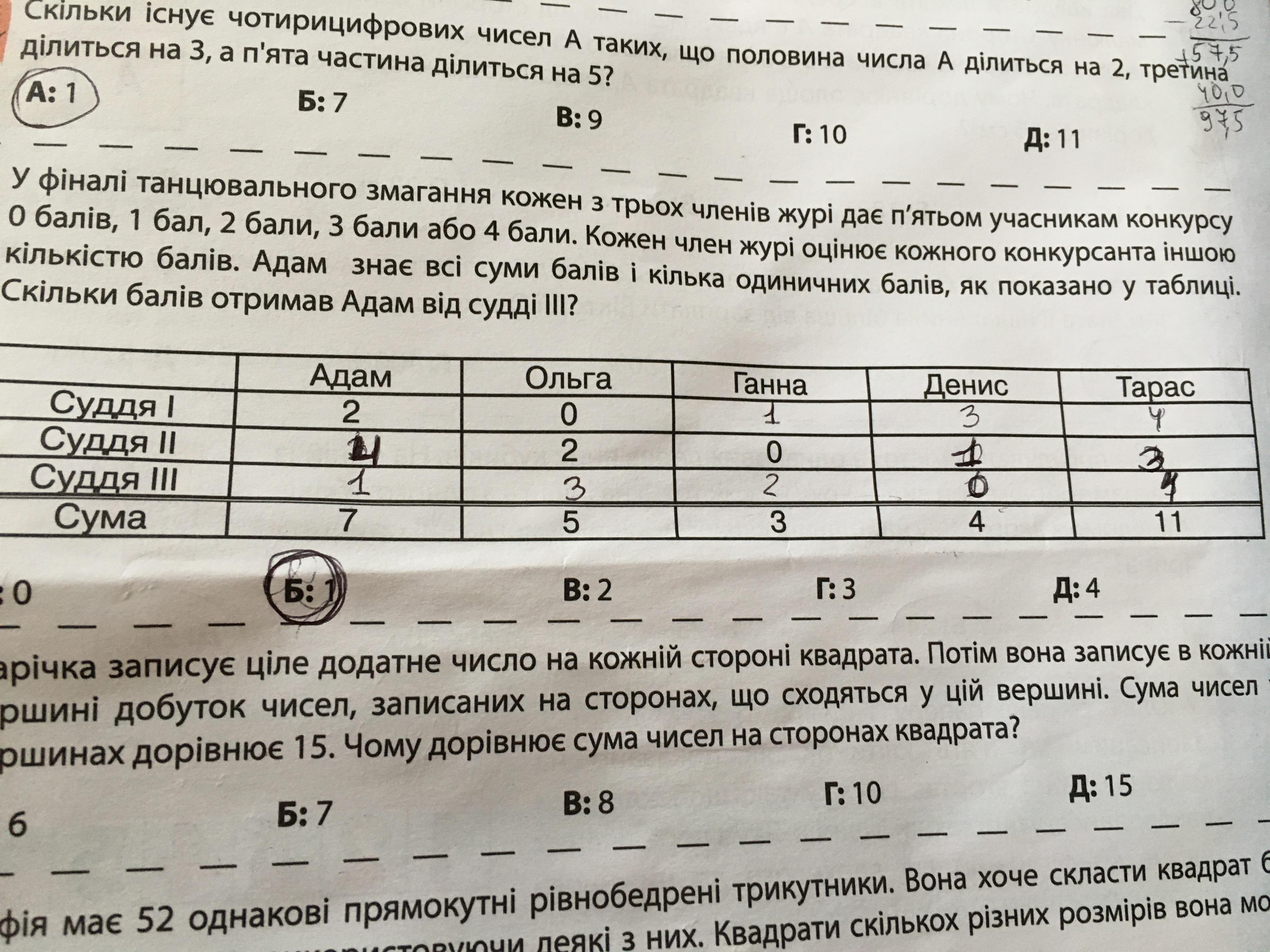 кількістю балів. Адам знає всі суми балів і кілька одиничних балів, як показано у таблиці.