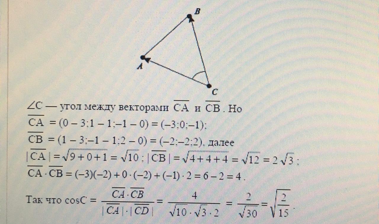 Дано точки А(0;1;-1), В(1;-1;2), С(3;1;0). Обчисліть косинус кута С