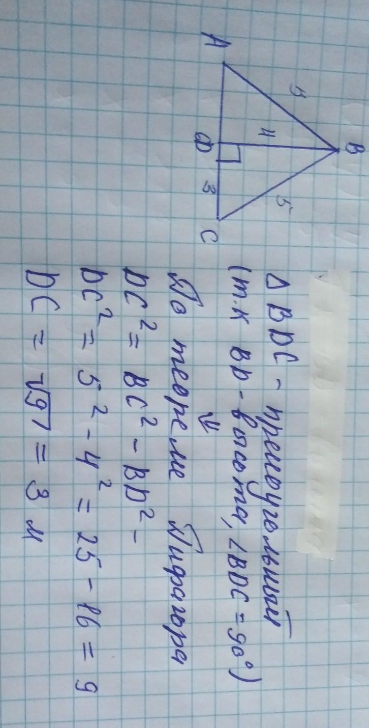 №7.Треугольник АВС- равнобедренный (АВ=ВС). ВД-высота. ВД=4 м, АС= 6 м, АВ=5 м. Чему равны стороны треугольника ВДС.