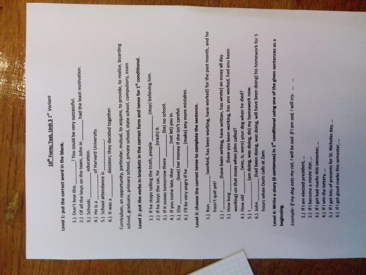 L1 1 opportunity 2 particular 3 provide 4 graduate 5 compulsory 6 mutual L2 1 will stop 2 will crash 3 will be 4 will not let 5 will lose 6 makes L3 1-2 has been working 2-1 3-3 4-1 5-1 6-1 L4 will (do something) здесь что-нибудь придумай в Future Simple