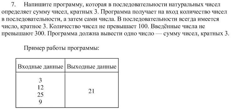 ReadSeqInteger(ReadInteger).Where(p -> p mod 3 = 0).Sum.Print