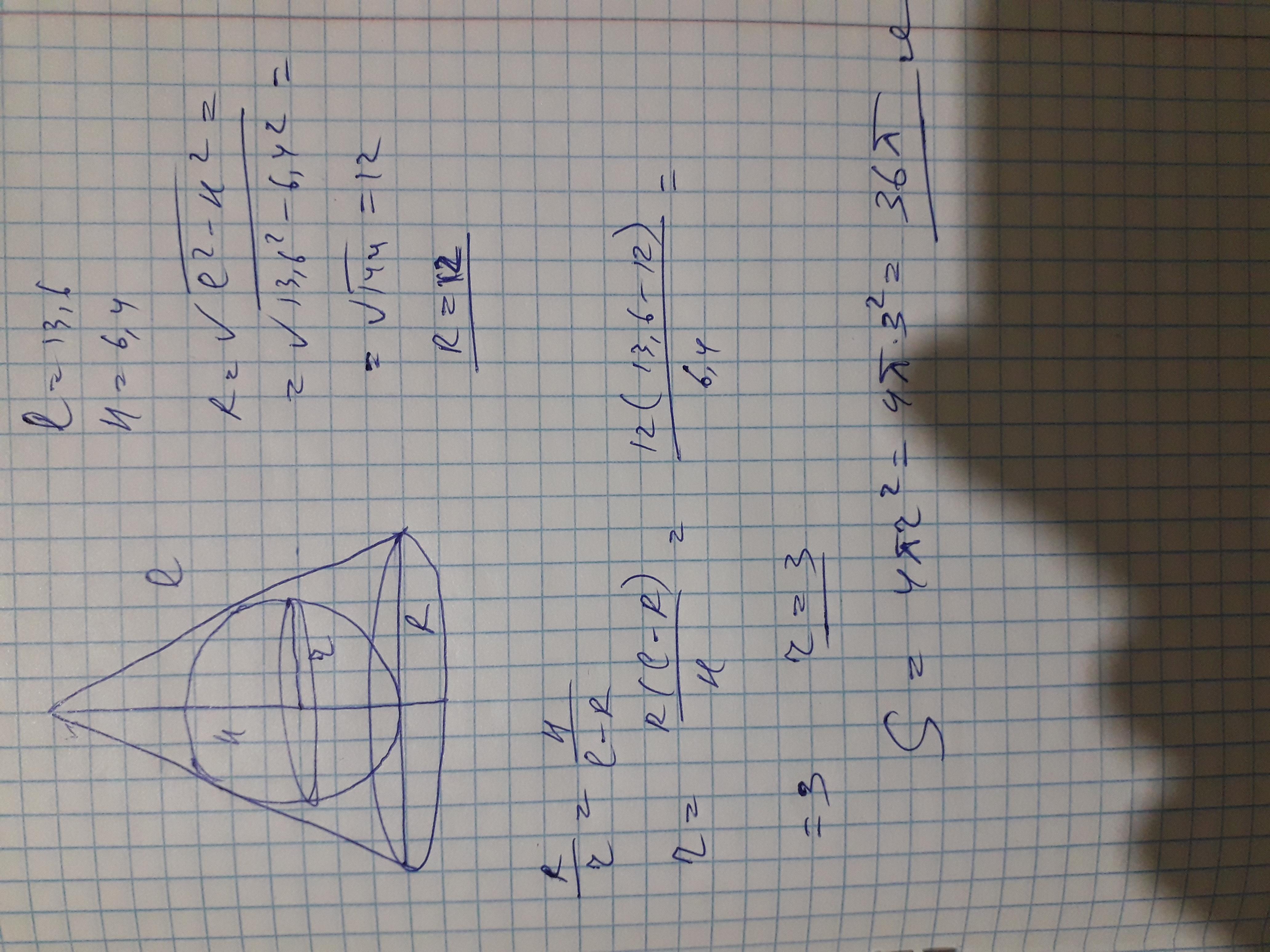 Вычислить площадь поверхности шара, вписанного в конус, если образующая конуса равна 13,6см, высота конуса равна 6,4см. (Если в промежуточном ответе большое количество знаков после запятой, округляй ответ до сотых.)