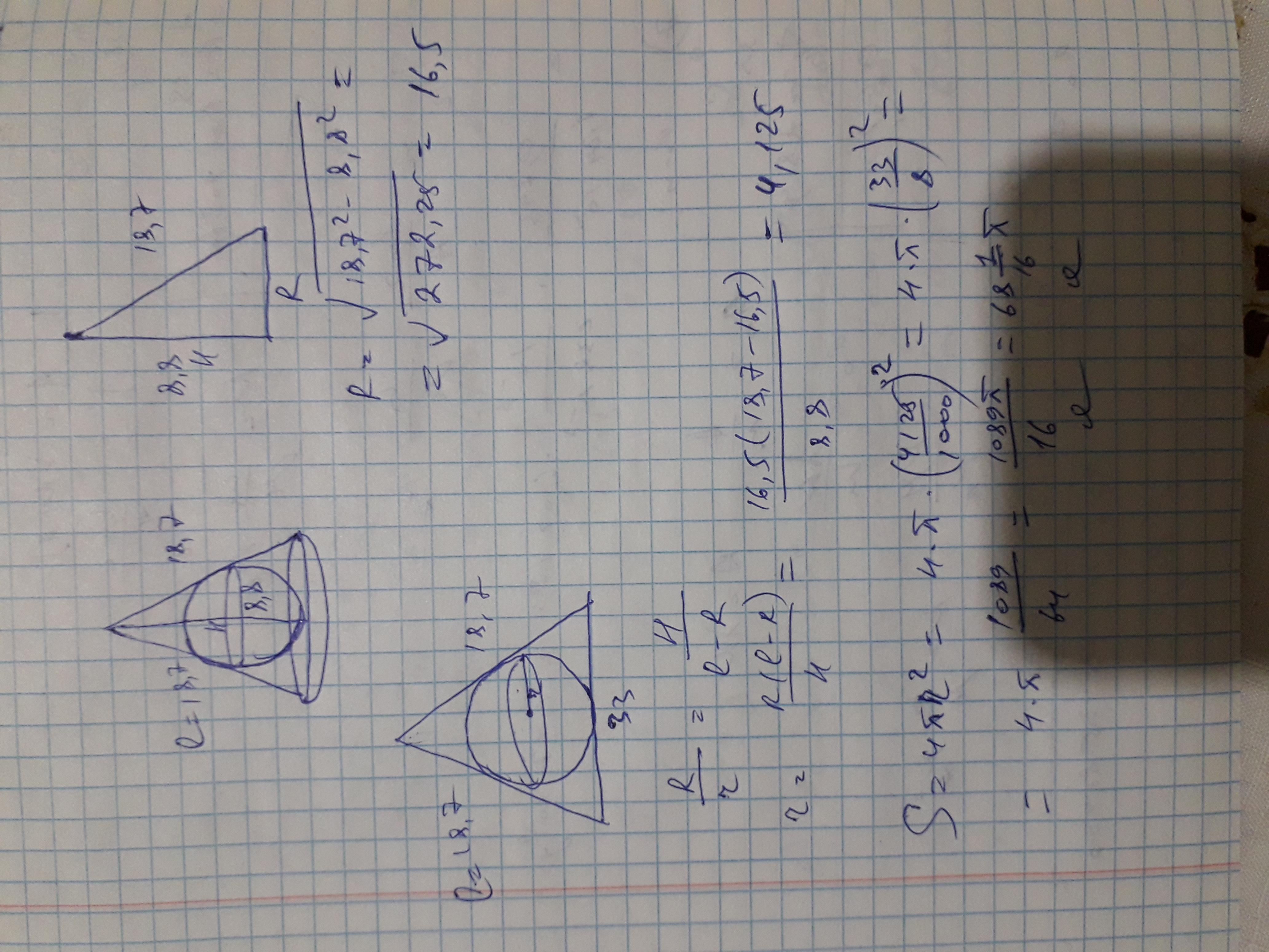 Вычислить площадь поверхности шара, вписанного в конус, если образующая конуса равна 18,7см, высота конуса равна 8,8см. (Если в промежуточном ответе большое количество знаков после запятой, округляй ответ до сотых.)