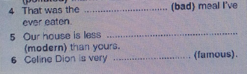 4. that was the worst meal I've ever eaten. 5. our house is less more modern than yours. 6. Celine Dion is very famous