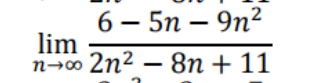 \lim\limits_{n\to\infty}\frac{-9n^2 - 5n + 6}{2n^2 - 8n + 11} = \lim\limits_{n\to\infty}\frac{-9 - \frac5n+\frac6{n^2}}{2-\frac8n+\frac{11}{n^2}} = -\frac92