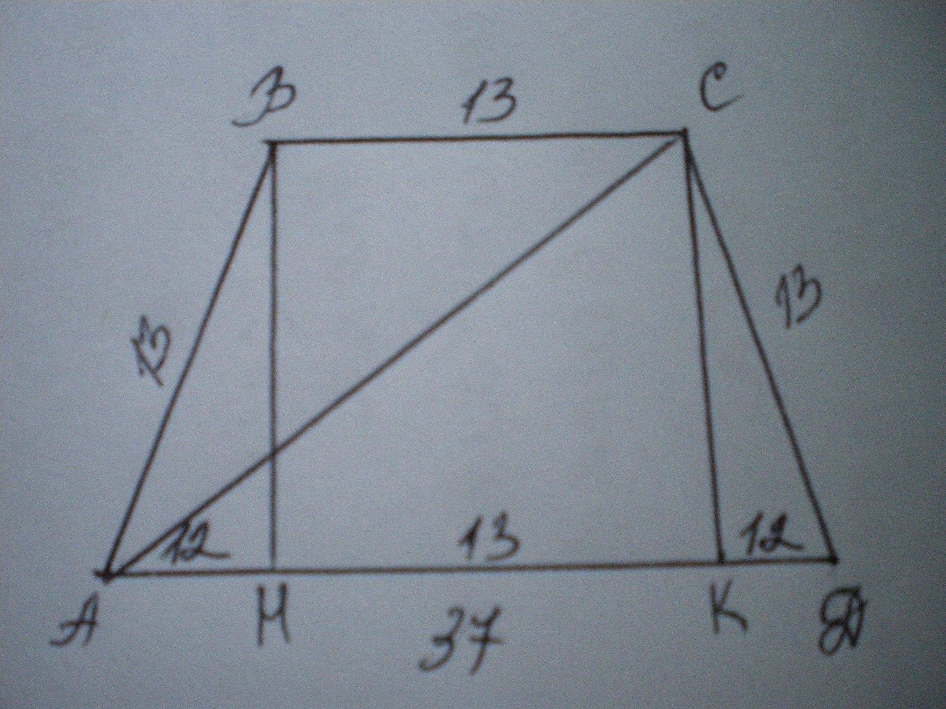 У рівнобічної трапеції ABCD основи якої дорівнюють 13 см і 37 см діагональ гострого кута ділить його навпіл Знайдіть площу трапеції