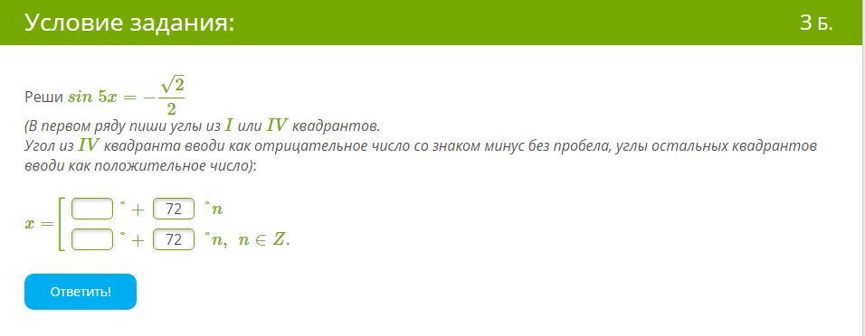 Угол из IV квадранта вводи как отрицательное число со знаком минус без пробела, углы остальных квадрантов вводи как положительное число):