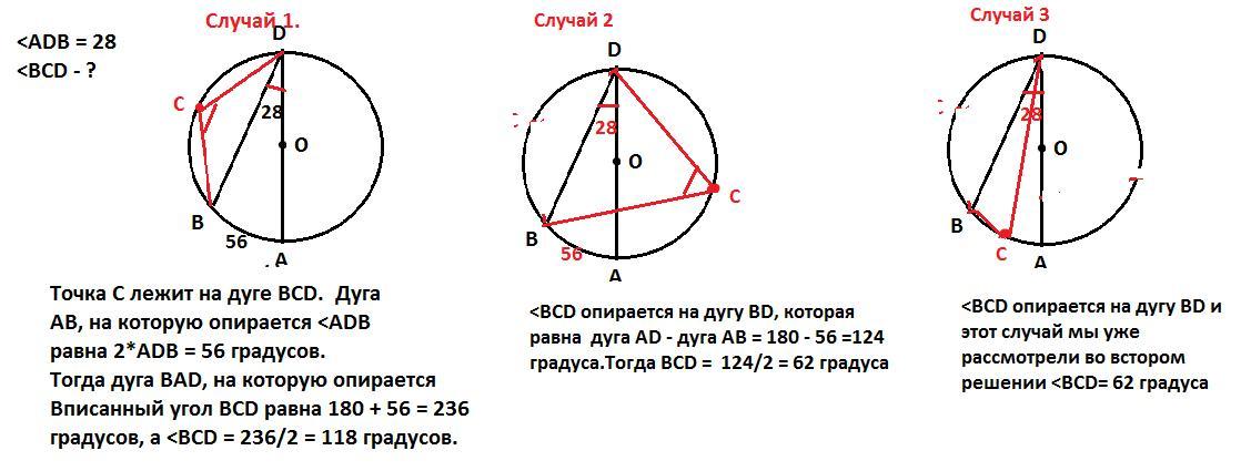 АД-диаметр окружности с центром в точке О. Точки В и С лежат на окружности, так что угол АДВ равен 28°. Найдите угол ВСД.