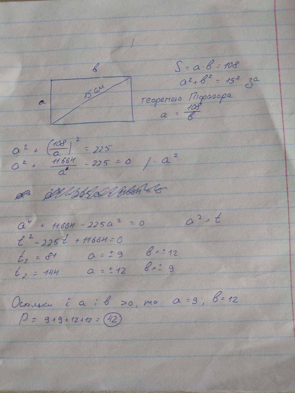 Знайдіть периметр прямокутника , якщо його діагональ дорівнює 15 см , а його площа дорівнює 108 см²