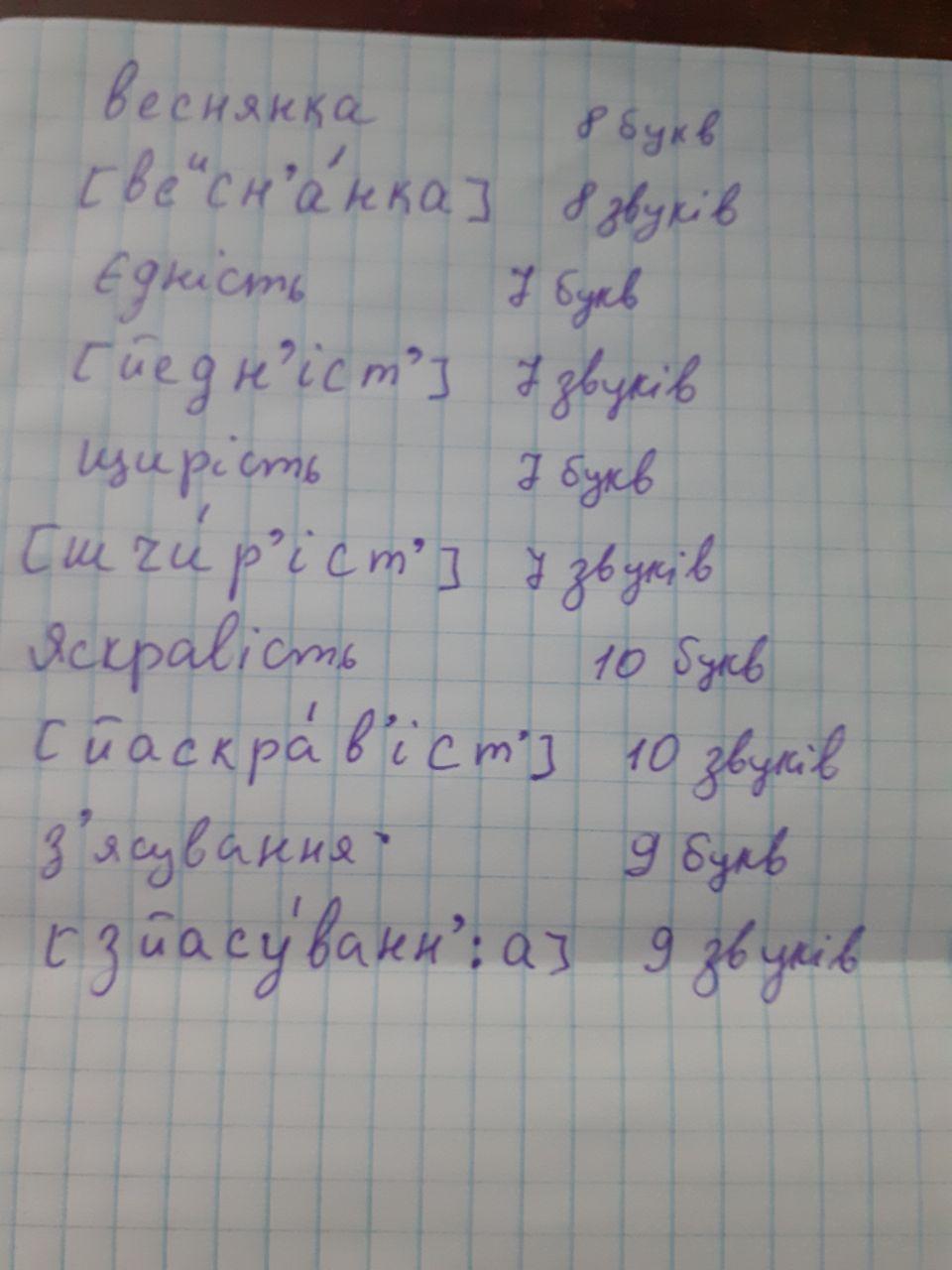 Запишіть слова звукописом, визначте кількість букв і звуків.